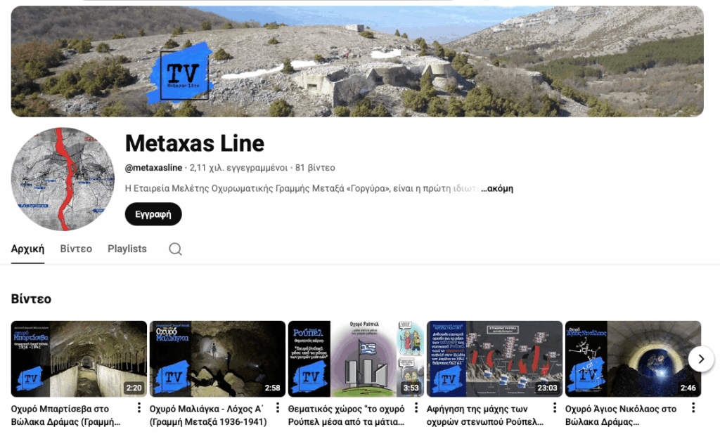 - Το πλούσιο βιντεοληπτικό και φωτογραφικό υλικό από τις έρευνες πεδίου είχε σαν αποτέλεσμα το 2013 , τη δημιουργία του διαδικτυακού πρώτου καναλιού στη ψηφιακή πλατφόρμα YouTube με τίτλο Metaxas Line (με ανελλιπή λειτουργία μέχρι σήμερα) και θεματολογία αποκλειστικά την οχύρωση Μεταξά.